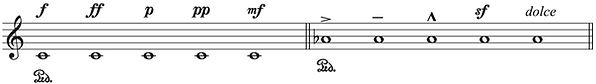 1. 下の譜例に従って、最大音で打鍵し、弦をたっぷり振動させます。